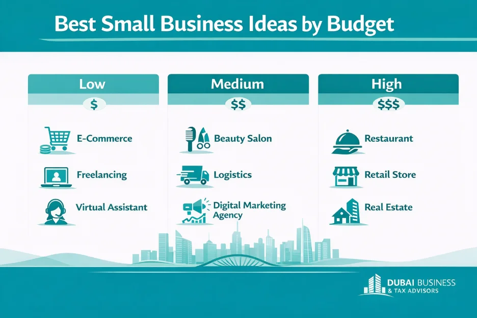| Under AED 20K | Freelance, Digital Marketing, Niche E-commerce | Free Zone Virtual Office |