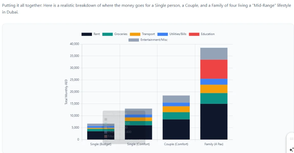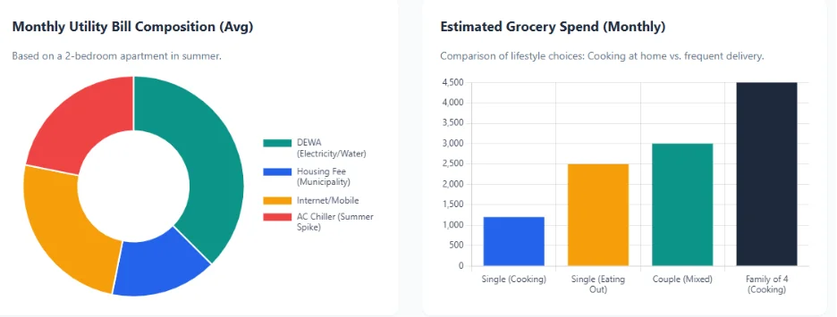 A single person may spend AED 800 to AED 1,200 per month. A family of four may spend AED 2,500 to AED 4,500.