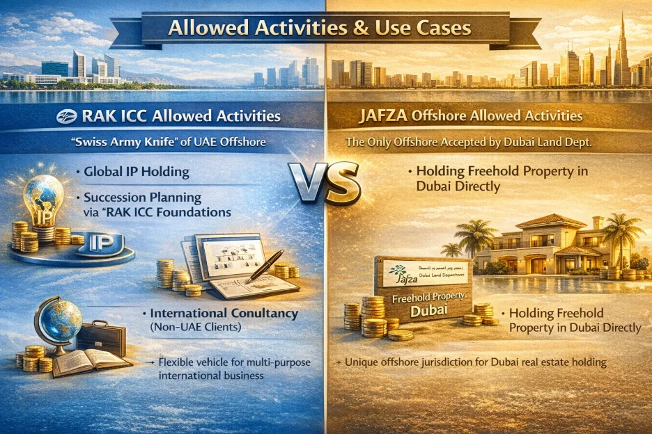 RAK ICC is the better choice for cost-efficiency, speed, and holding international assets or IP. JAFZA Offshore is the superior choice specifically for holding freehold property in Dubai, as it has a direct, seamless integration with the Dubai Land Department (DLD).