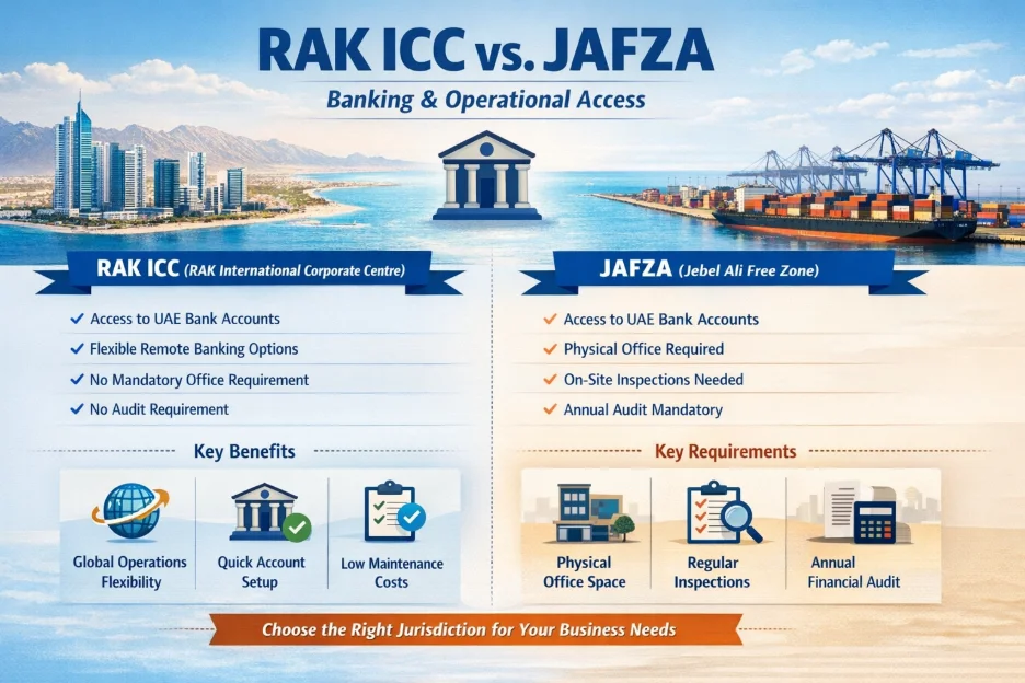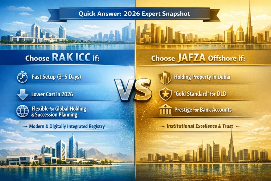 Choosing between RAK ICC Vs JAFZA offshore in 2026 is a decision that impacts your tax liability, your banking success, and your regulatory standing. RAK ICC remains the champion of agility and value, while JAFZA Offshore stands as the pillar of Dubai-centric prestige and real estate holding.