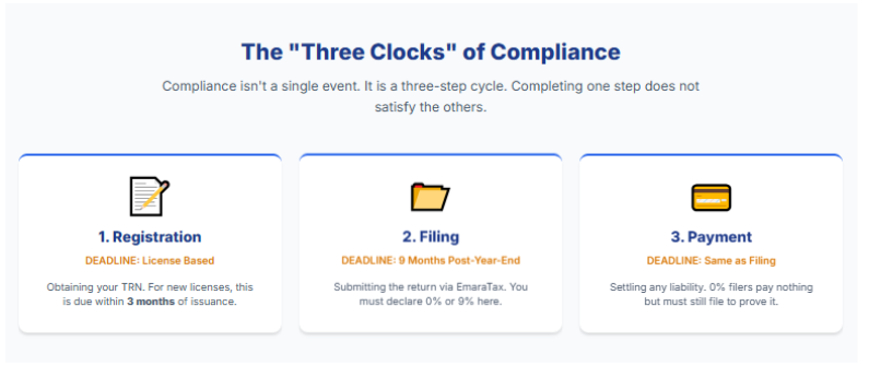 A common mistake is treating Corporate Tax compliance as a single event. Every Free Zone business must manage three distinct and critical compliance clocks: Registration, Filing, and Payment. Failure to meet the timeline for any one of these can trigger severe penalties.