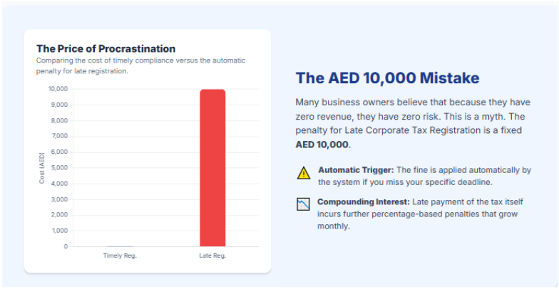 This immediate deadline is the single highest administrative risk for new Free Zone startups. Missing the corporate tax registration deadline UAE by a single day due to oversight, or the incorrect belief that zero-trading activity offers immunity, will result in the AED 10,000 fine. This system prioritizes administrative control (getting all entities registered) over immediate tax calculation (filing).