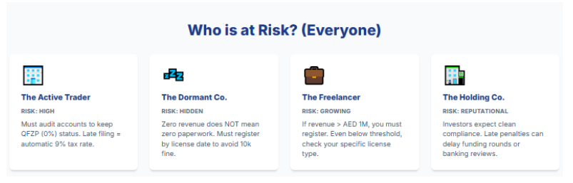 This category presents the highest risk of non-compliance. Owners of such entities often assume inactivity equals exemption. This is highly dangerous. They must still register by their license-based deadline. The FTA focuses solely on the license issue date, not whether the revenue is zero. Ignoring these free zone corporate tax deadlines means willingly accepting the AED 10,000 fine for late registration.